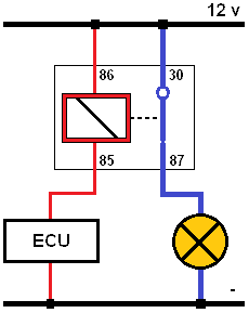 Example: the image next to this shows a relay circuit. The ECU switches the relay control current on or off. When pin 85 is switched to ground by the ECU, current flows through the relay coil and it becomes magnetic. As a result of the magnetic field, the switch for the main current is pulled closed.