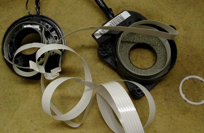 A special wire is needed to connect the steering wheel airbag to the control unit. A regular wire could wear out over time with frequent steering. This wire is also known as a slip ring, clock spring, or spiral spring, with the most common term being clock spring. It is a long, wide, flat wire (or ribbon) wound around the steering shaft. This design allows for maximum steering input. When dismantling the clock spring, it’s important to note its position, as twisting it before installation can cause the spring to break upon steering. This would trigger the airbag warning light since no voltage can be sent to the steering wheel airbag. A broken clock spring should not be repaired but replaced.