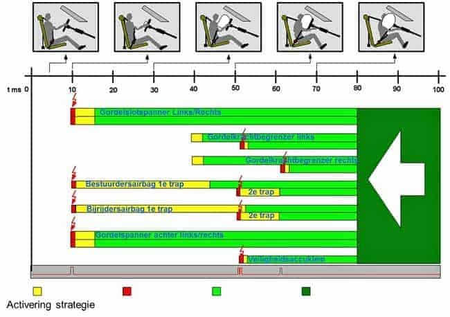 Besides the airbags, the control unit activates more safety components to protect vehicle occupants as effectively as possible. Not all components are deployed simultaneously. The timing is programmed into the control unit’s software. Depending on the severity of the collision, the following safety components are activated: