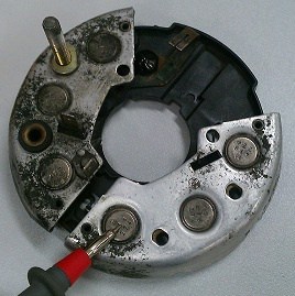The image shows a disassembled diode bridge. The red test lead indicates one of the three negative diodes. On the other side of the diode bridge are the positive diodes. The stud is the B+ terminal, with the thick cable connected to it leading to the battery.