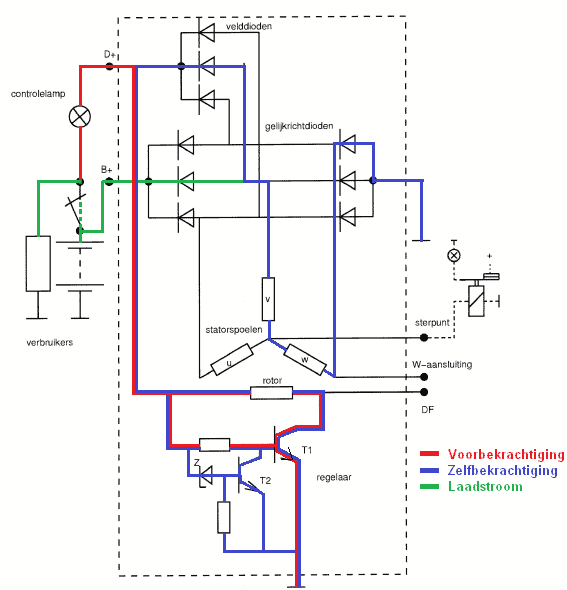When the engine starts, the rotor is sufficiently magnetized to switch to self-excitation. The self-excitation current flows via the negative rectifier diodes, stator coil, field diodes to the rotor, and through the voltage regulator to ground.