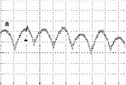 The signal in Chart 2 was taken with many consumers on. Here, the rotor is considerably more excited to reach the 14.4 volt charging current. The duty cycle here is about 50%.
