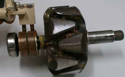 The adjacent image shows an exploded view of an alternator. The pulley is mounted in the housing with a bearing. The rotor shaft is attached to the pulley, which rotates when the pulley is driven by the serpentine belt. The stator is mounted between the two parts of the housing, where the rotor spins. Often, a plastic cover is found on the rear of the alternator, hiding the voltage regulator and the alternator connections.