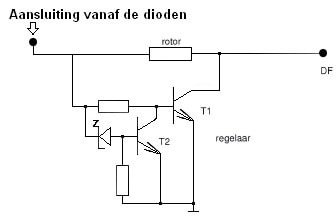 If the voltage at the D+ terminal is below the set regulation voltage, current flows from D+ through the rotor to the D- terminal (ground), causing the alternator to generate voltage. When the D+ voltage exceeds the regulation voltage, the zener diode conducts, turning on transistor T2, preventing transistor T1 from conducting, and halting current through the rotor. The magnetic field is disabled, and the charging voltage decreases. The voltage drops until the zener voltage ceases, allowing transistor T2 to cut off and transistor T1 to conduct again. This cycle repeats continually.
