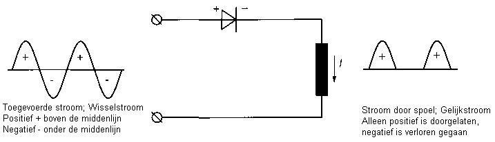 The alternator supplies AC, but since only DC is used in the vehicle, the AC must be converted to DC. This is achieved using rectifier diodes. Diodes allow current to flow in one direction only. The positive part of the AC is utilized while the negative part is discarded.