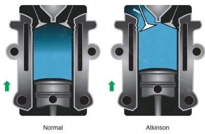 With the Atkinson-Miller principle, the intake valve remains open longer during the compression stroke at part load (approximately 20 to 30 crankshaft degrees): the intake air partially flows back into the intake manifold. The amount of air above the piston after the intake valve closes is much lower than in engines where the intake valve closes at the end of the intake stroke. With less air above the piston, less air needs to be compressed (less resistance during the compression stroke). The amount of fuel to be injected is also less: less air means less fuel.