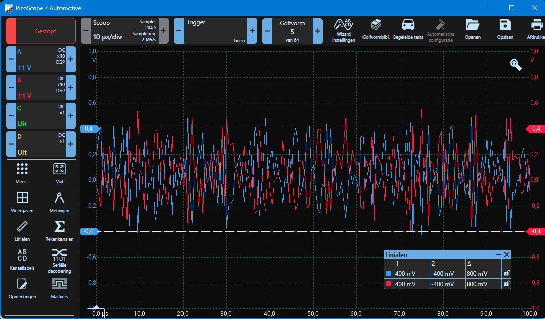 Below is a measurement displayed of the signal behavior of 100BASE Ethernet. Just like with CAN bus, the signals of channel A and B go in opposite directions: when the voltage of channel A goes high, the voltage of channel B goes low, and vice versa. The ECUs determine the voltage difference between the two signals.