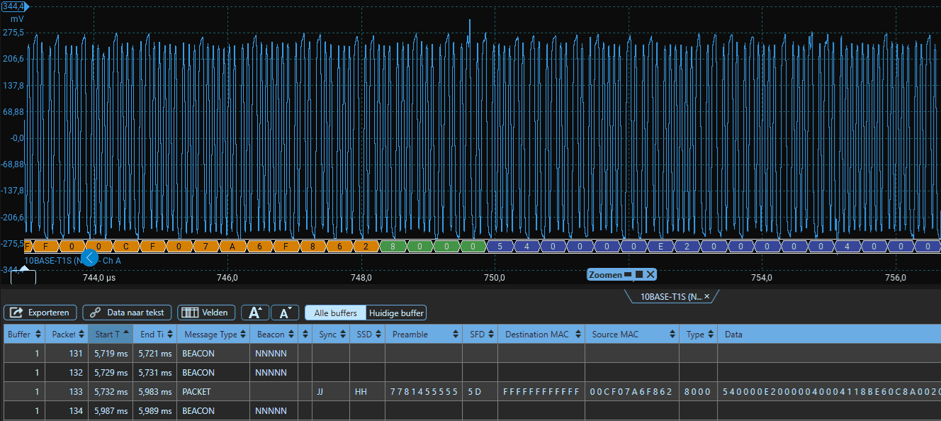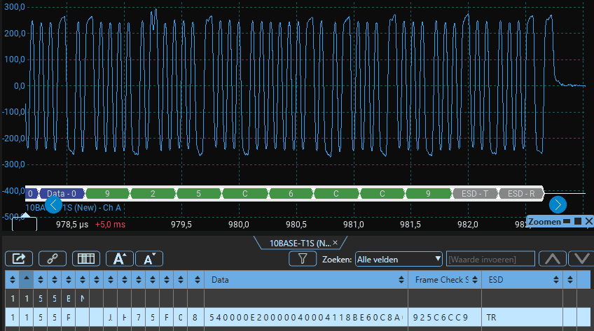 The screenshots above with explanations covered the first part of the Ethernet signal. Below is the complete signal. In the decoding, you can just see the orange and green sections on the left for the Preamble, Destination, and Source MAC. Then the blue/purple section of the decoding begins: this is where the data starts. In the screenshot above, the data starts with 540000E2000004000. The total amount of data is estimated to be about two hundred times larger.