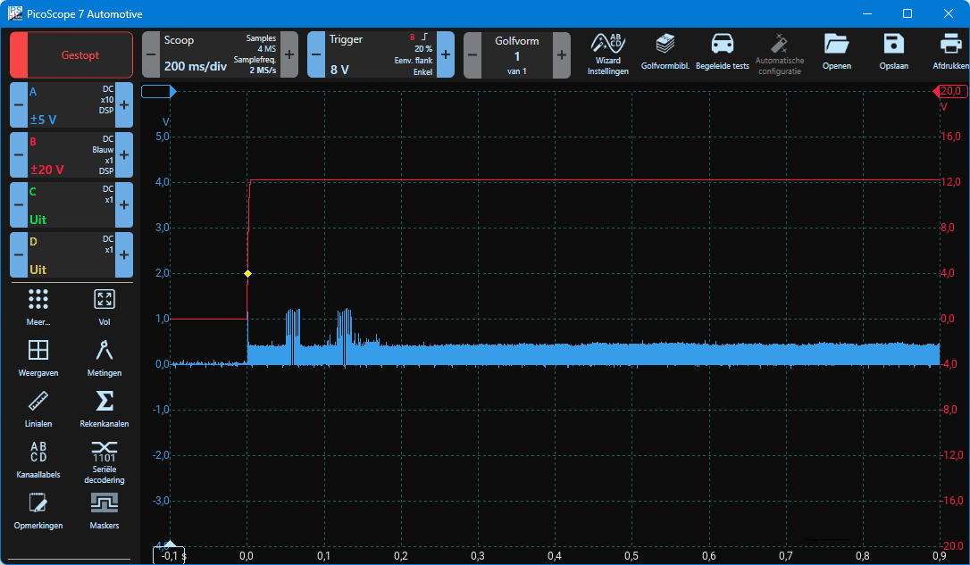In the oscilloscope screenshot below, the wake-up line (channel B) can be seen rising from 0 to about 12 volts at t = 0 sec. At the moment the wake-up line is activated, communication on the Ethernet line begins. The result is visible on measurement channel A.