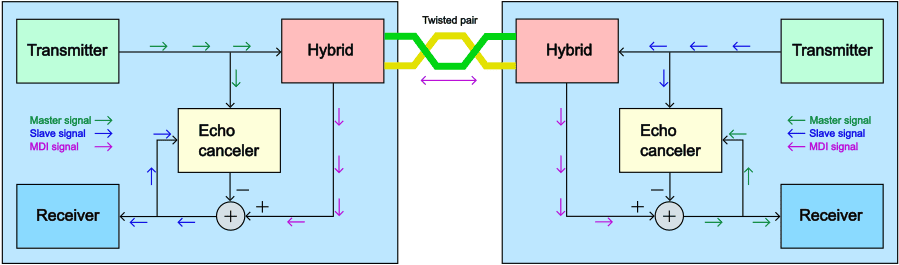 The image below shows how full-duplex communication over a single twisted wire pair is made technically possible. Both ECUs simultaneously transmit and receive via the same Ethernet wiring. The transmitter’s transmission signal is put onto the twisted pair via the hybrid, but part of that same signal leaks directly back to its own receiving chain. This leaked-back signal is called the echo. At the same time, the transmission signal from the other ECU comes in via the same wire pair. The signals on the Ethernet wires thus always contain a combination of the ECU’s own transmit signal, its echo, and the signal received from the other side.