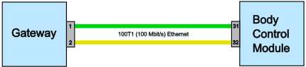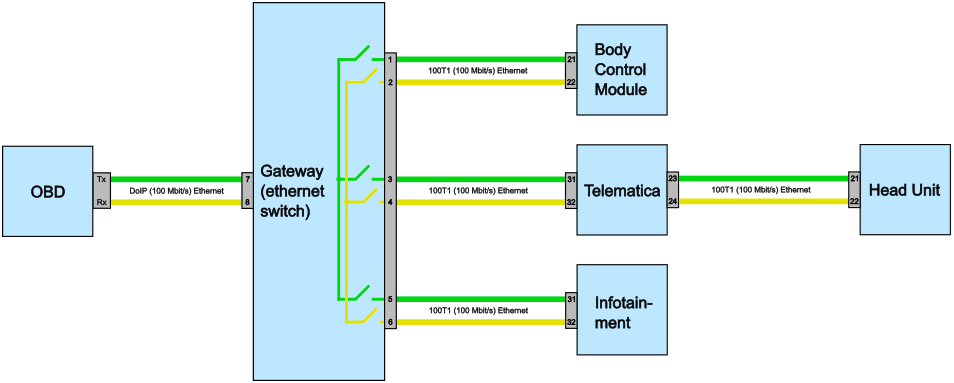 The ECUs of the 100BASE and 1000BASE, which are not directly connected to each other via Ethernet, can communicate with each other via an Ethernet switch. The switch can connect two (sub)networks as soon as communication between them is needed. Example: in the image below, the “Body Control Module” can communicate with the “Infotainment Module” via the Ethernet switch in the gateway.