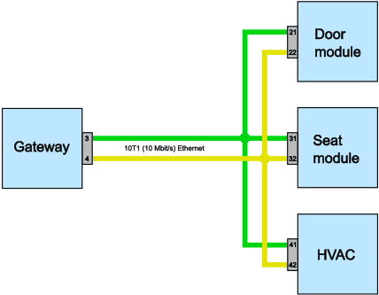 The topology of 100BASE and 1000BASE is characterized by a maximum of two ECUs communicating with each other via twisted pair Ethernet wires. This means: there is one ECU at each end of a wire pair. There are no nodes installed that connect other ECUs to this network, as seen in 10BASE Ethernet and CAN bus. In literature, you often see “module to module communication” or “ECU to ECU communication.” This refers to the topology described in this section.