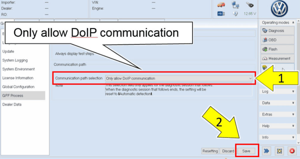 The main functional reason for using DoIP is the considerably higher data rate and communication speed compared to diagnostics over CAN. This is especially relevant when programming and flashing ECUs and when handling larger datasets. In practice, this means shorter programming times and faster loading times when reading vehicles with a lot of software and a large number of ECUs. When programming ECUs, it is sometimes necessary to manually switch from CAN to DoIP. The screenshots below show ODIS (VAG) with a selection option for DoIP before starting the scan, and the manual setting for flashing via DoIP.