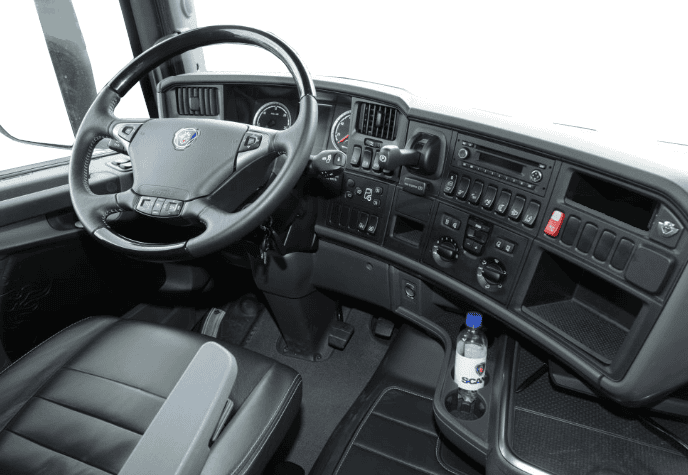 In the following image we see the dashboard of a Scania R730 (2010) with the parking brake lever next to the steering wheel, in the dashboard.