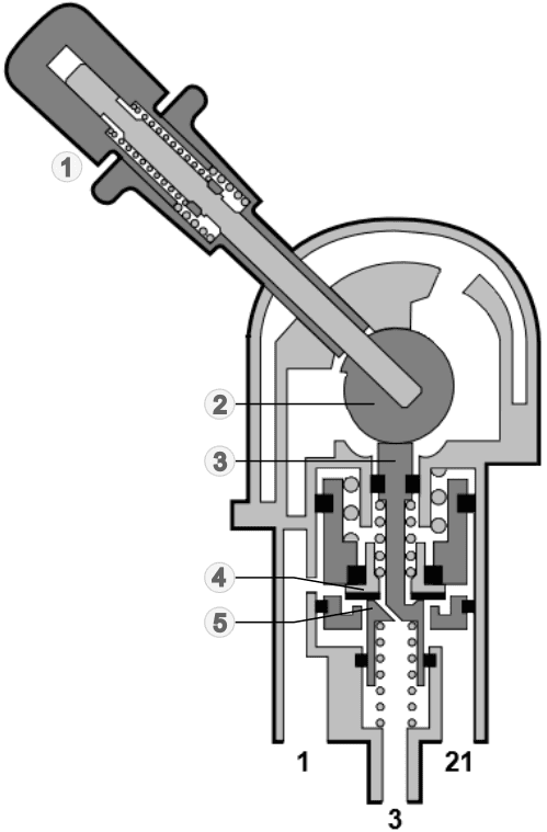 The sealing valve (4) and the underside of the push rod (5) provide the blocking or air passage during the different positions. In the state shown, sealing valve 4 blocks the passage of air between inlet (code 1) and outlet (21). When the truck is put on the parking brake, the air from connection 21 escapes via the vent connection (code 3) to the atmosphere.