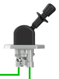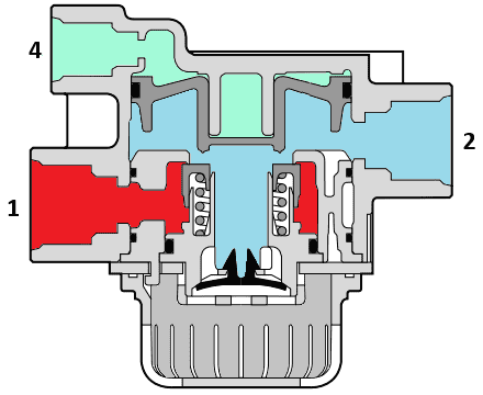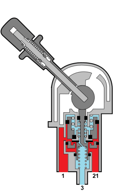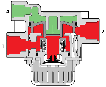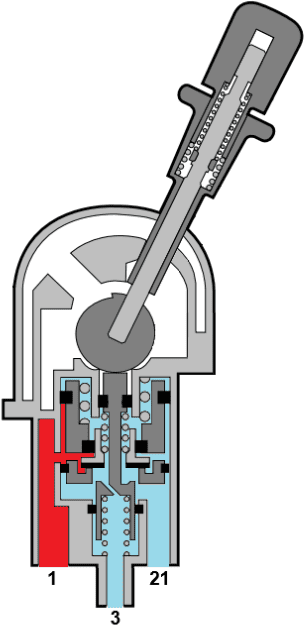 The images below show the relay valve in the de-energized and energized states. The level of control pressure determines the position of the plunger that is pushed down. The further the plunger is pushed down, the larger the opening between 1 and 2 will be.