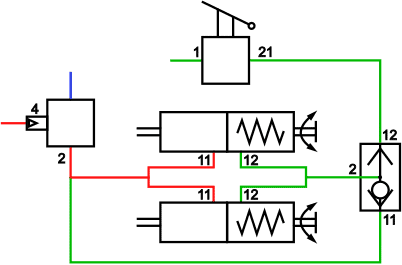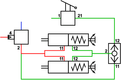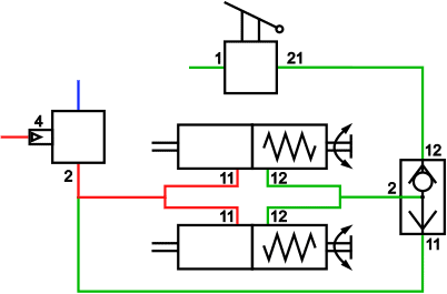 - Driving position: inlet 1 and 21 are interconnected, so that the air supply from the air tank reaches the spring brake cylinders. The spring brake cylinders are operated by the air pressure, releasing the brakes;