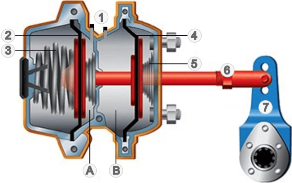 The illustration below shows a combined diaphragm and spring brake cylinder. Number 1 indicates the air connections with which the air chambers A (parking brake) and B (service brake) are pressurized and vented.