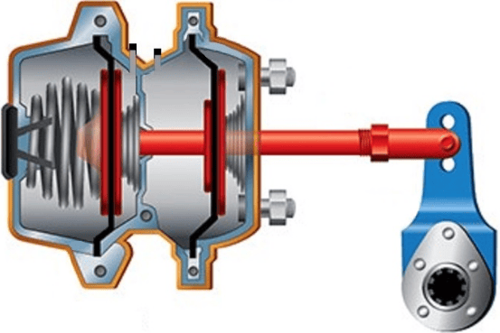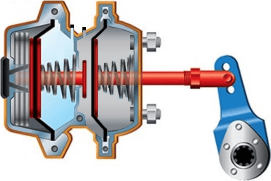 When the parking brake lever is moved to the “park” position, this releases the air pressure from the left air chamber. The spring pushes the push rod fully to the right, pressing the brake linings firmly against the discs or drums.