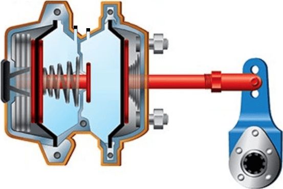 The force with which the brake lining is pressed on is partly dependent on the lever ratio and the air pressure in the diaphragm cylinder. The diaphragm cylinder is used in the service brake. The diaphragm cylinder is not suitable for parking, because with the engine switched off in the parking position there is (assuming the reservoirs are no longer filled) no air pressure available to press the brake linings against the disc or drum. That is why trucks are fitted with a spring brake cylinder for the parking brake, which is often combined with the diaphragm cylinder for the service brake.