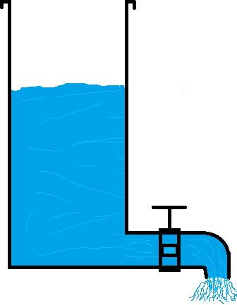 When the tank is filled with water, the water pressure at the faucet increases. The water pressure can be compared to the concept of voltage in electricity. The system must be closed; otherwise, the water drains away, and there is no more water pressure.