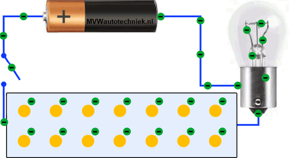 - Switch closed: due to the battery creating a voltage difference, an electron flow is created from negative to positive. The current flows through the lamp and causes it to light due to the electron flow and the voltage difference.