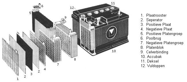 The positive plates are connected to the positive terminal, and the negative plates to the negative terminal. To prevent connection errors, both terminals are marked, and the positive terminal always has a larger diameter than the negative terminal. The positive and negative plates are interconnected using a bridging piece. The plates consist of a grid made of lead alloy. The grids are filled with paste (a mixture of lead powder, sulfuric acid, and various applications). The separators are made of plastic and cellulose. During the energy conversion in the battery, more heat is developed at the positive plate than at the negative plate. To prevent warping of the positive plate, the positive plate is always placed between two negative plates.