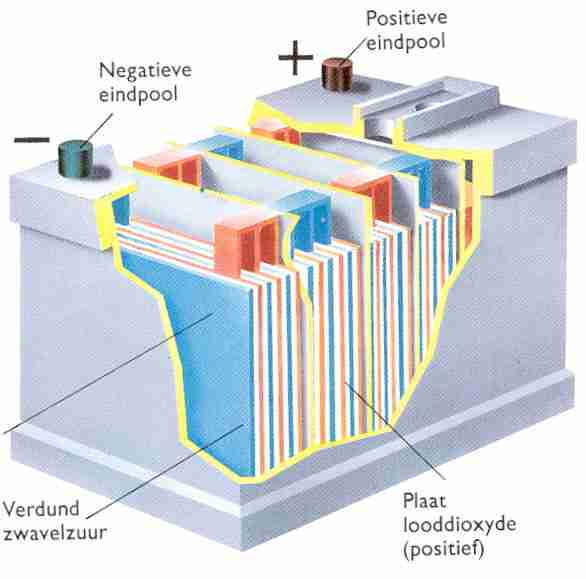 When a consumer is connected to the lead plates charged in the aforementioned manner, current flows. The lead dioxide on the positive plate is once again converted to lead sulfate. The porous lead of the negative plate is also converted to lead sulfate. Thus, during charging and discharging of the batteries, a transformation occurs in the positive and negative plates (chemical action). The electrolyte also undergoes a transformation during charging and discharging. When the battery is discharged, the positive and negative plates consist of lead sulfate. The sulfur used to form lead sulfate is extracted from the electrolyte. Thus, the electrolyte of a discharged battery has a low sulfur content. In a charged battery, the lead sulfate of the plates is transferred to the electrolyte, which then has a high sulfur content. Since the sulfur particles are the heavier particles in the electrolyte, the specific gravity of the electrolyte increases as the state of charge of the battery increases. A fully charged battery has an electrolyte with a specific gravity of 1280 kg/m3. When the battery is fully discharged, the electrolyte has a specific gravity of 1140 kg/m3. For comparison: water has a specific gravity of 1000 kg/m3.