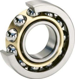 An angular contact bearing can efficiently handle radial forces, but axial forces in only one direction. The raceways of the inner and outer rings are shifted relative to each other, forming a contact angle. The angle determines the direction in which axial forces can be absorbed. In principle, the ball bearings are “pressed more against the outer ring” under axial load. This type of bearing can be designed with one or two rows of ball bearings. In the image below, the bearing is designed with a single row of ball bearings.