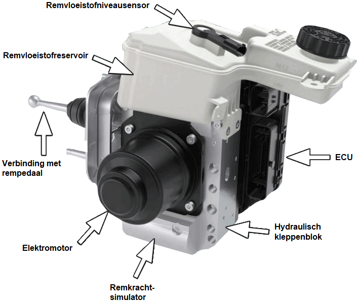 - No vacuum brake booster is used anymore, since the electric motor provides the required fluid pressure;