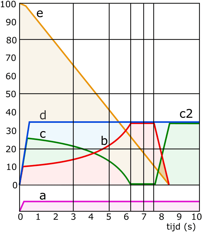 The graph shows the transition of the two braking systems while brake deceleration remains constant. The driver’s pedal force (a) remains the same for 10 seconds. When braking begins, the hydraulic service brake and regenerative braking on the electric motors work together. In the first six seconds we see that the deceleration due to regenerative braking increases. The electric motor functions as a generator and supplies the HV battery with the generated energy. The braking force of the hydraulic service brake decreases further and further until it no longer contributes. After approx. 7.5 seconds we approach a standstill of the vehicle and the electric braking force drops off. The hydraulic braking force increases again. After 8.5 seconds the vehicle is at a standstill. The driver keeps the brake pedal depressed briefly.
