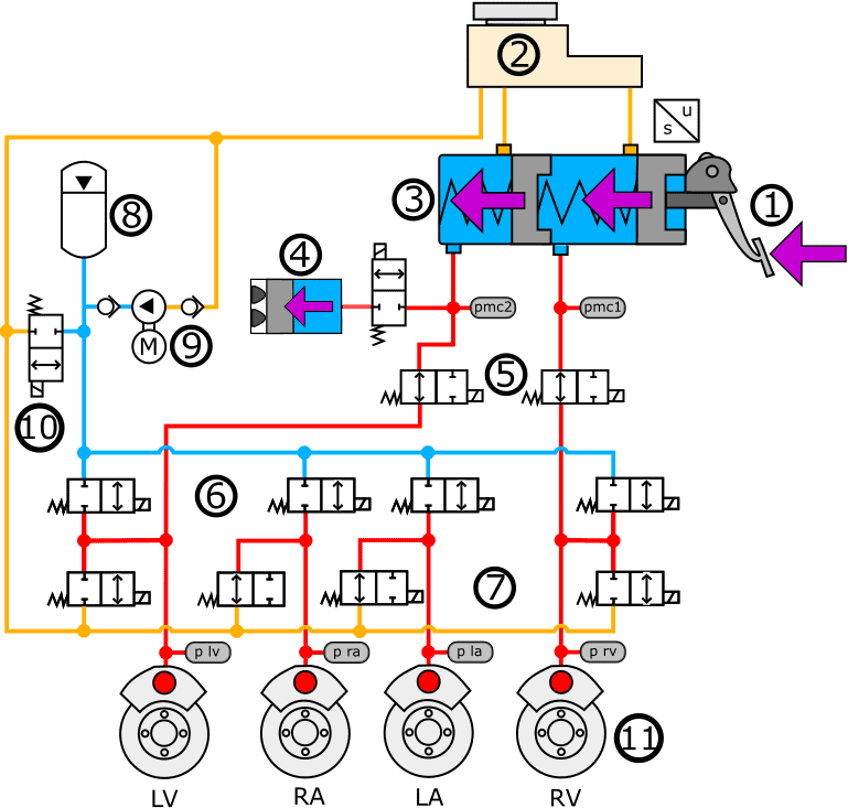 The diagram below is based on the Toyota Prius 3. With the brake pedal (1), brake pressure is built up in the master cylinder (3). During gentle braking, braking is done only on the electric motors. The brake pressure simulator (4) provides counterpressure while pressing the brake pedal. The valve for the brake pressure simulator is opened under normal operating conditions. During hard braking, the lock valves (5) are opened and the valve for the simulator is closed. The brake calipers of the front wheels are supplied with brake pressure. Opening and closing the hydraulic valves (6) makes it possible for brake pressure to also reach the rear wheels. The brake pressure sensors (from left to right: p lv through p rv) measure the pressure and pass it to the ECU. Using a PWM signal, the hydraulic valves (5, 6 and 7) are regulated based on the desired brake pressure.