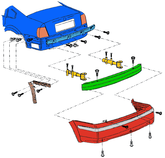 The rear bumper (red) is slid into the guide pieces (brown) during installation. After the bumper has been slid in, it is finally secured with a number of bolts.