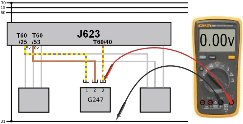 The connector is removed from the sensor. Upon measuring in the connector, we measure 0 volts.