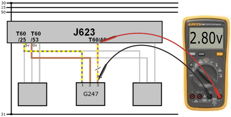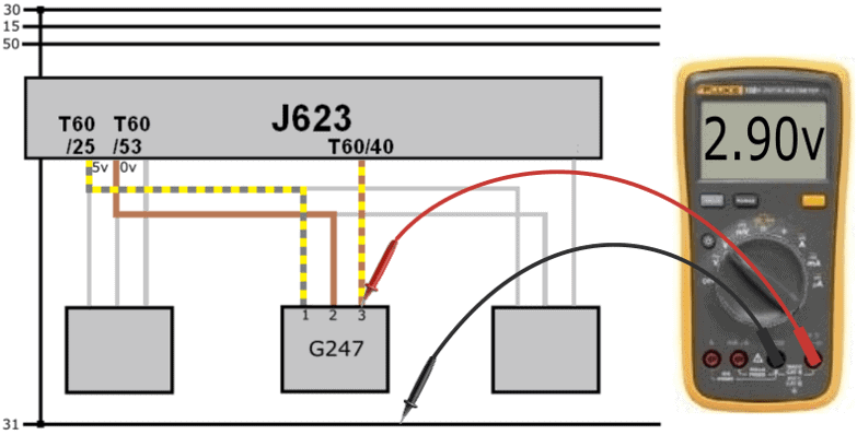 The 2.9-volt sensor signal is sent to the ECU. However, we measure a voltage of 5.7 volts at the ECU.