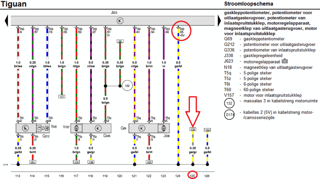 We look up coordinate 125 to trace the yellow/gray wire. The next diagram shows that the yellow/gray wire is connected to junction D174 (5-volt supply line) which is connected to several components. The supply line ends up with the yellow/blue wire at the ECU on pin 25. This is the power supply wire for the fuel pressure sensor, among others.