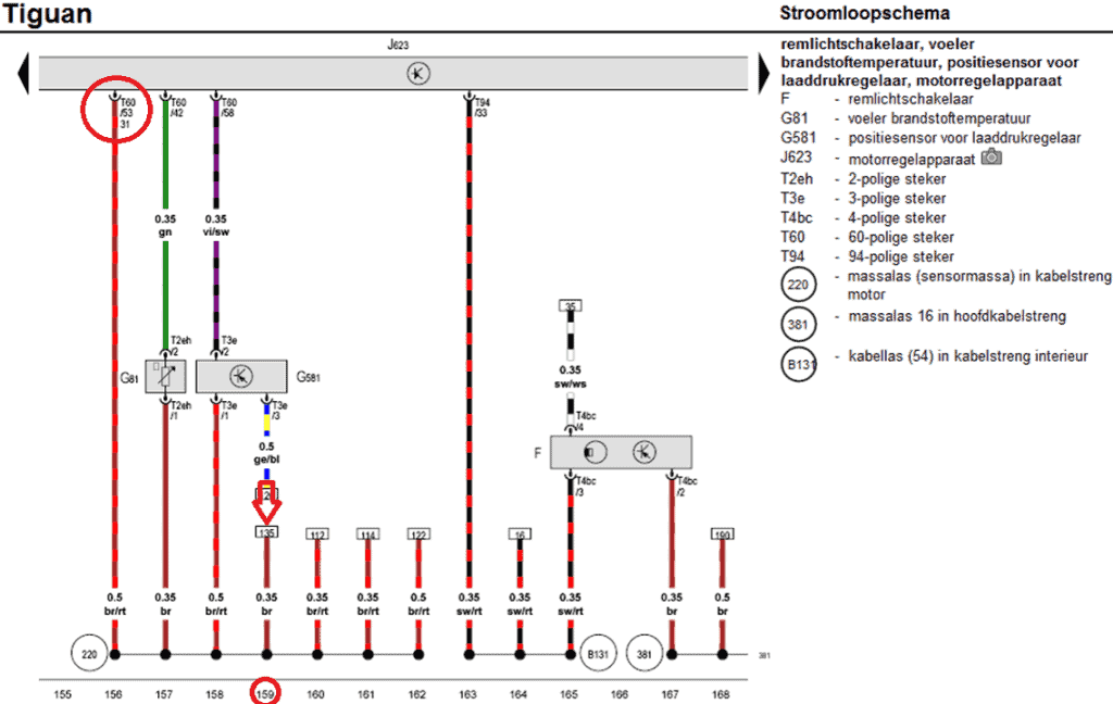 We now follow reference 159 and end up in the next diagram. The brown wire leads to a ground junction and is connected to pin 53 of the ECU.