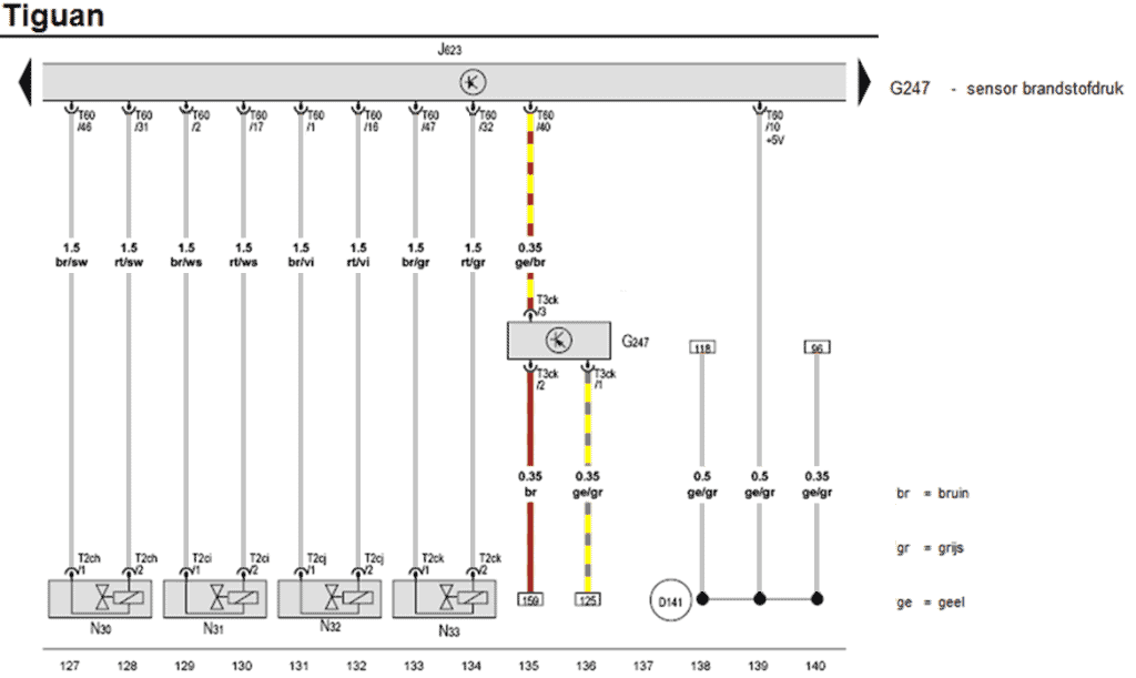We locate the fuel pressure sensor with component code G247 in the wiring diagram. The sensor has a three-pin connector (T3ck). The yellow/brown wire (pin 3 of the sensor) is connected to pin 40 on the engine ECU (J623). This is the signal wire. The other two wires (pin 1 and 2) go via references 159 and 125 to other locations in the diagram.