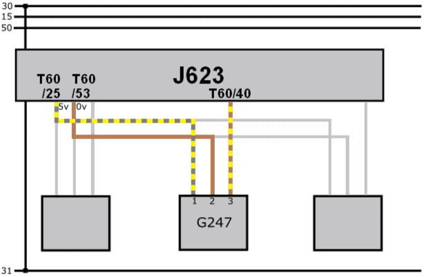 The original wiring diagram contains references: this can cause confusion. For that reason, we create a simplified diagram. It shows the common power supply and ground (pins 25 and 53) and the signal wire (40).