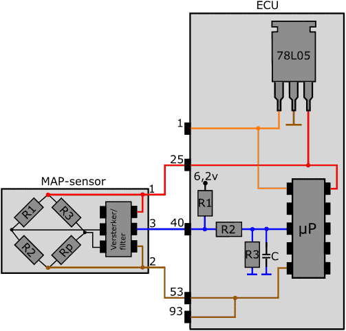 In the next image the circuit in the ECU is shown. The signal from the active MAP sensor is sent via the blue wire to pin 40 of the ECU. In the ECU there are a number of resistors (R1, R2, R3) and a capacitor (C). The signal wire from the sensor is connected inside the ECU between resistors R1 and R2.