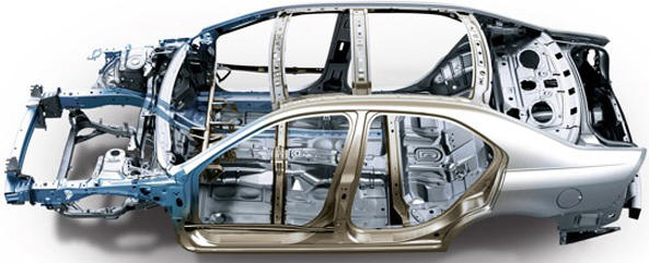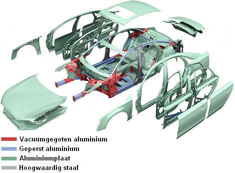 Audi also uses the term “space frame.” In the aluminum frame structure, all panels and plates contribute to body rigidity. Due to the very sturdy aluminum panels, the aluminum body is extremely strong and highly crash-resistant, while lowering vehicle weight. The construction of an Audi space frame is shown in the image below.