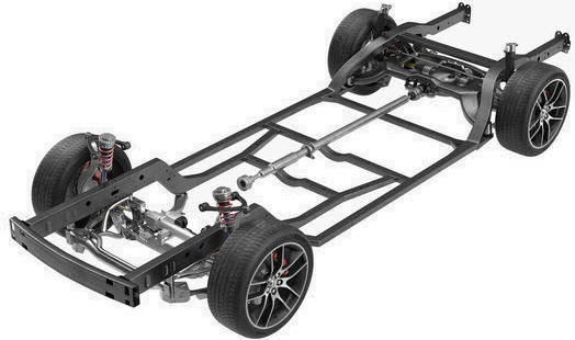 The ladder frame gets its name because the chassis indeed resembles a ladder. Between two thick longitudinal steel beams, several crossbeams are attached. All components of the suspension system are mounted to the longitudinal and crossbeams.