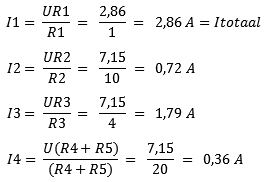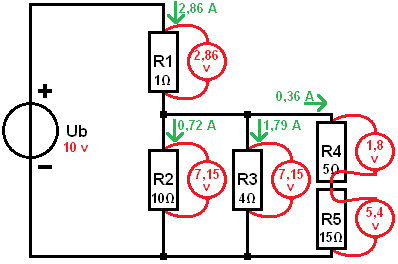 The image shows the complete overview with currents and voltages. To practice this yourself, you can change one resistance value and go through all the steps again.