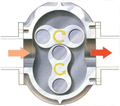 The two lobes in the image on the right rotate in opposite directions. They do not touch each other during rotation. Because the upper lobe rotates clockwise and the lower lobe counterclockwise, air is carried along the top and bottom of the supercharger housing. This air contributes to the pressure filling of the engine.