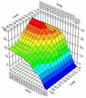 This engine control unit is connected to two plugs with often more than 100 individual wires. Each wire has its own function; for example, pin number 6 receives information from the coolant temperature sensor, and via pin 81, the ECU controls the fuel injector of cylinder 1. All sensors in the engine compartment send their information to the ECU. This information is processed by the engine management system within the ECU into what is known as a map. An example is shown in the image below: