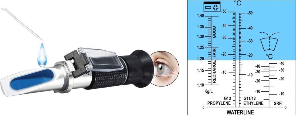 - A refractometer can measure the refraction of light through liquids, also known as an optical meter. The higher the antifreeze content, the more slowly light passes through, with a stronger bending effect on the light. By applying a few drops of coolant on the glass, the refractive breakpoint can be observed through the viewfinder against the light. The dividing line between white and blue (see the image below) indicates the temperature down to which the coolant provides protection. In the example, it is -28 b0C. Measuring tap water without additives will show a separation dropping to 0 b0C;