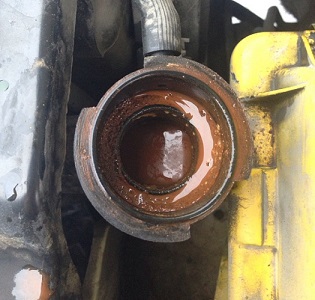 The images below show coolant where the additives have depleted, and likely dilution with tap water has occurred. The coolant turns brown, coloring all parts and channels in the cooling system. This “rust water” can be flushed out, after which the system can be refilled with new coolant. If not done in time, defects such as water pump leakage, leaking seals and gaskets, clogged (heater) radiator, faulty thermostat, and deposits on the cooling system walls can occur.