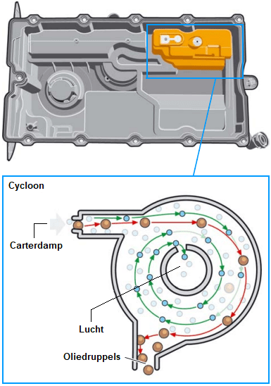 The images below illustrate the positions of the labyrinth and cyclone oil separators. The crankcase vapor enters the labyrinth (left). In the labyrinth, large oil residues are separated from the passing air. From the labyrinth, the crankcase vapor moves into the cyclone section to remove the last oil residues from the air.