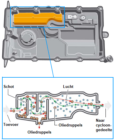 The images below show a valve cover from a 2.0 TDI VW engine. Both types of oil separators are installed in the valve cover.