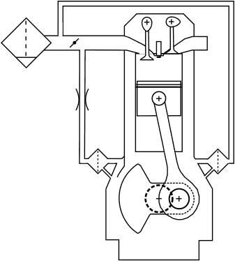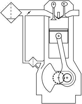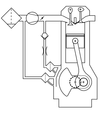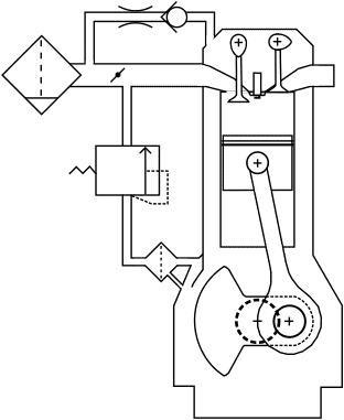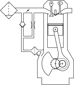 The crankcase breathing system consists of an oil separator and a hose leading to the air tube between the air filter and the throttle valve. This is the simplest type of crankcase breathing system commonly found in passenger cars. Several disadvantages are associated with this construction: